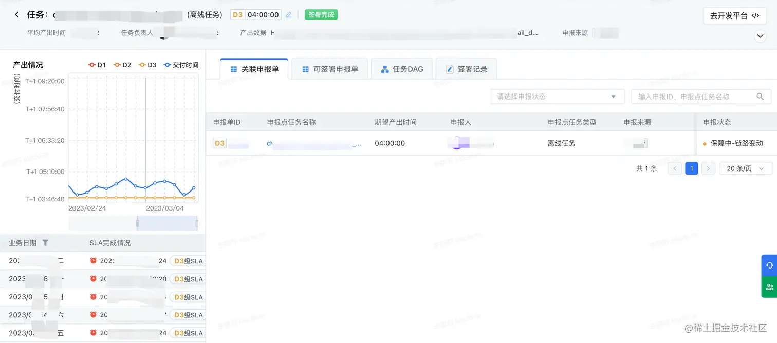 之后是完成签署,签署也会在产品里面体现出来。每个节点时间都有实时监控,如果产生了延迟,会推动业务做复盘和登记。我们也提供基础的DAG,包括申报业务单的查看,同时也可以让大家去查看每个等级的破线情况,以及团队对业务的服务情况。