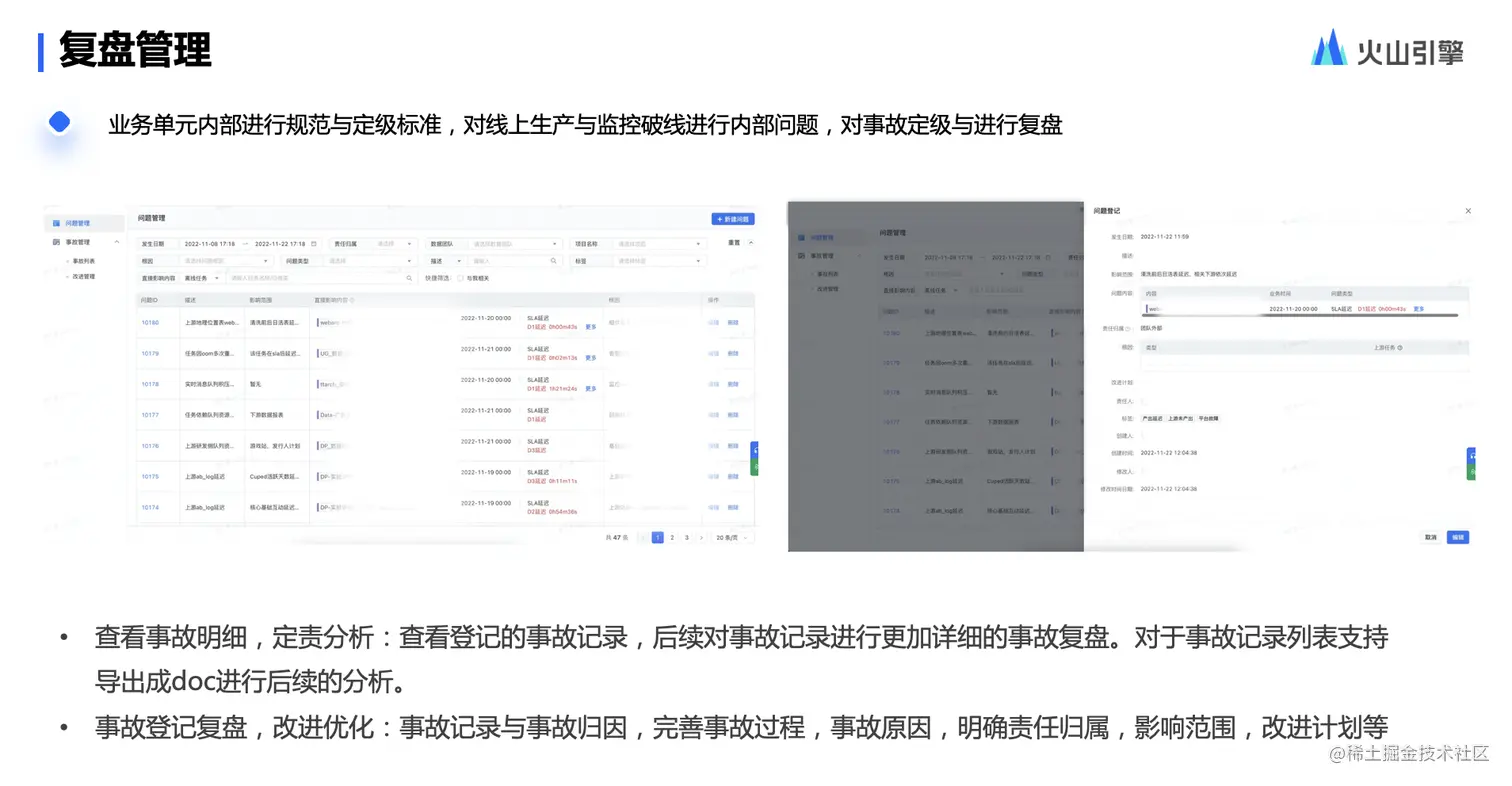 复盘管理是一个通用模块。业务根据自身需要去识别任务是否需要复盘,或者仅仅做问题登记。除此之外,业务还可以用复盘管理能力做内部管理,比如查看、检索所有的事故复盘,查看每个事故发生的原因和改进计划。同时,也可了解归因分布情况,并帮助下一个值班同学快速反馈和定位问题。