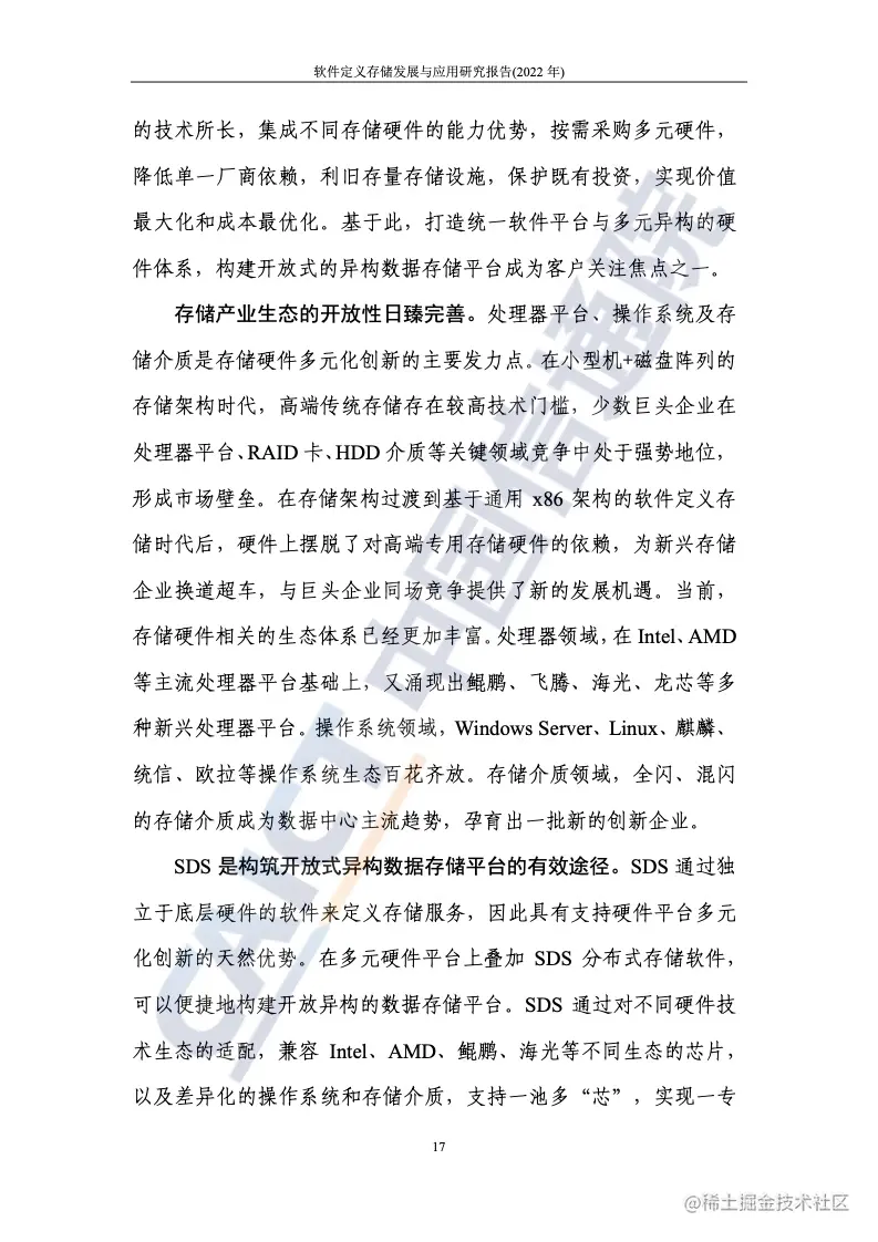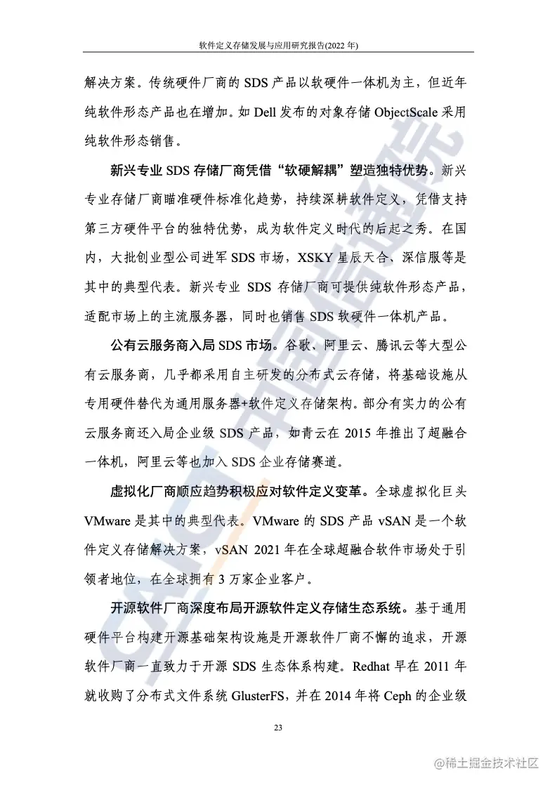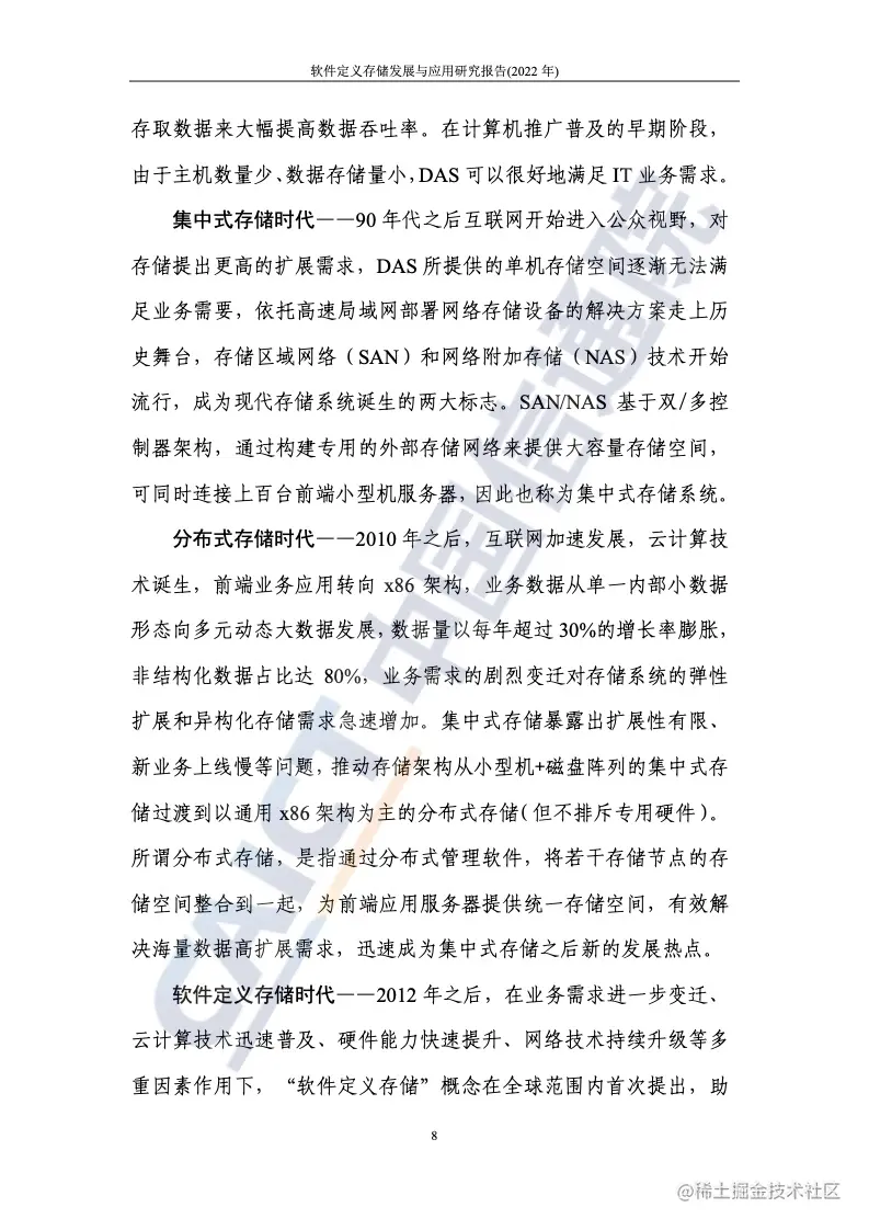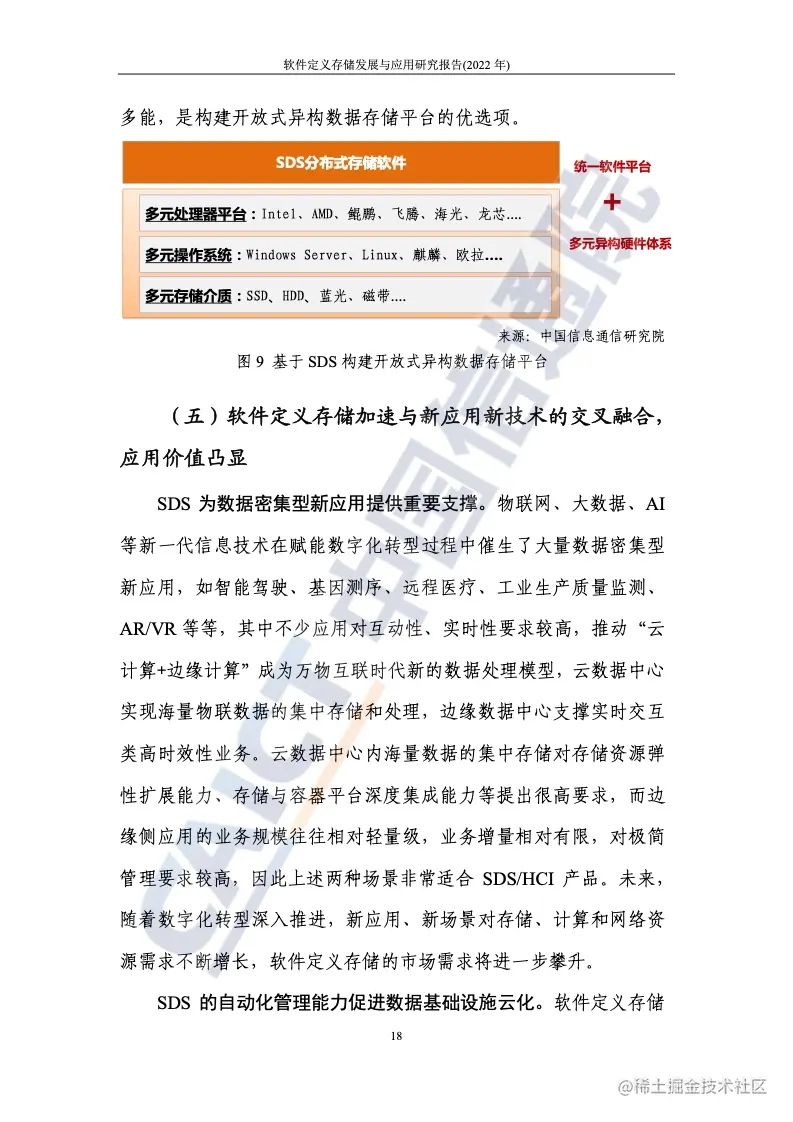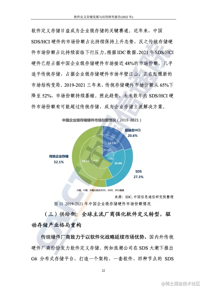 近日,中国信息通信研究院(以下简称“中国信通院”)正式发布《软件定义存储发展与应用研究报告(2022年)》,报告厘清了软件定义存储的概念内涵、技术特征和比较优势,对软件定义存储的市场态势、生态发展和赋能价值进行了分析研判,对其发展前景进行了展望,并对推动软件定义存储高质量发展提出有关建议。