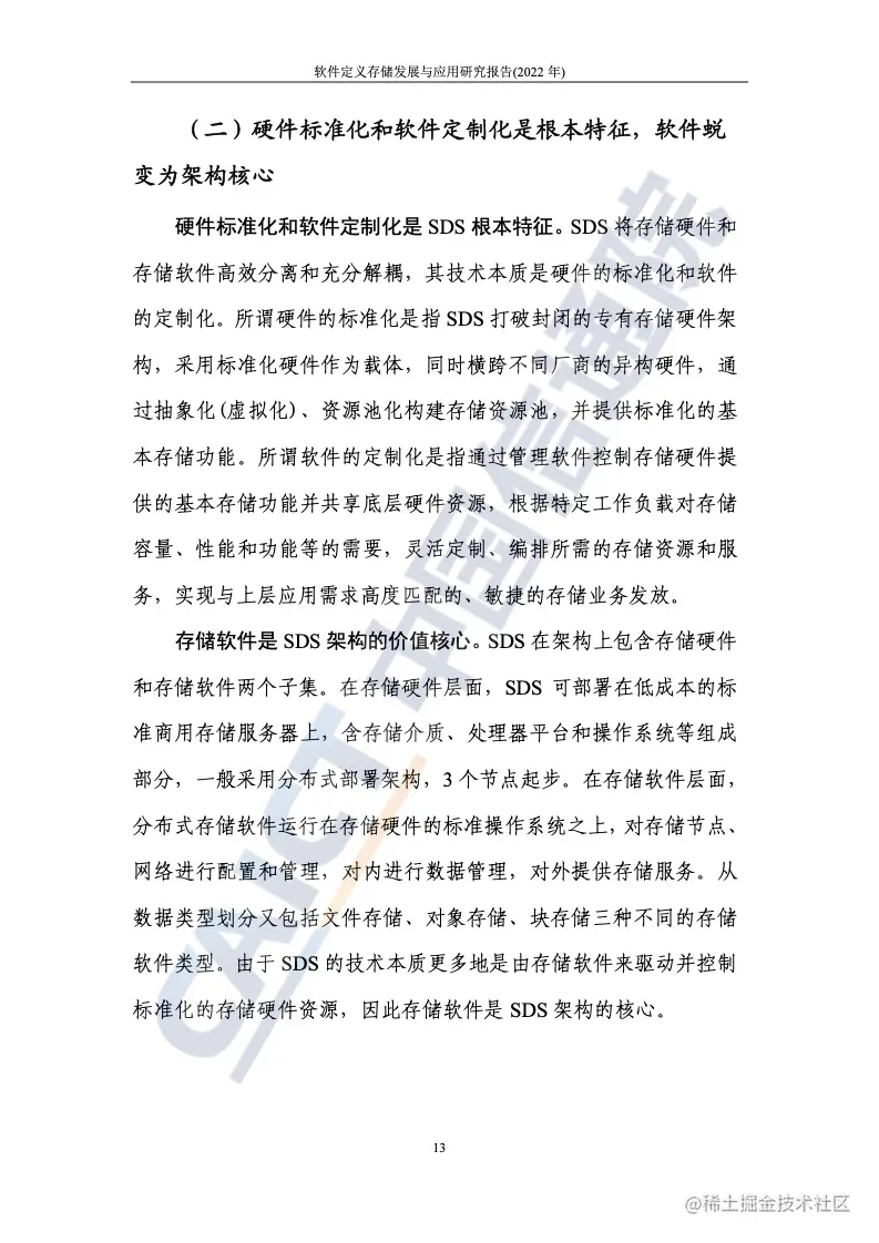 存储软件是软件定义存储架构的价值核心。SDS在架构上包含存储硬件和存储软件两个子集。在存储硬件层面,SDS可部署在低成本的标准商用存储服务器上,一般采用分布式部署架构。在存储软件层面,分布式存储软件运行在标准操作系统之上,对存储节点、网络进行配置和管理,对内进行数据管理,对外提供存储服务。由于SDS的技术本质更多地是由存储软件来驱动并控制标准化的存储硬件资源,因此存储软件是SDS架构的核心。