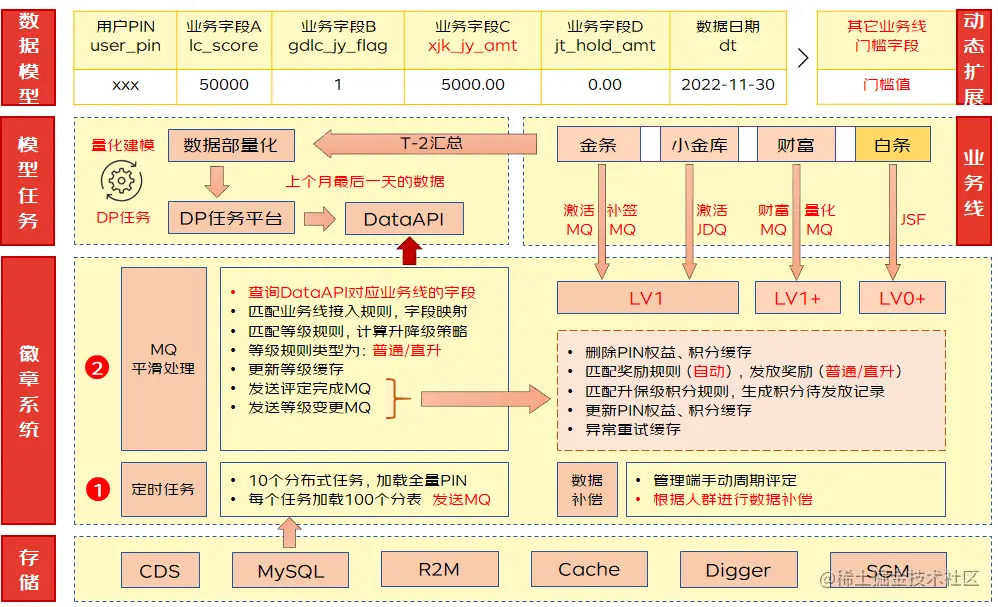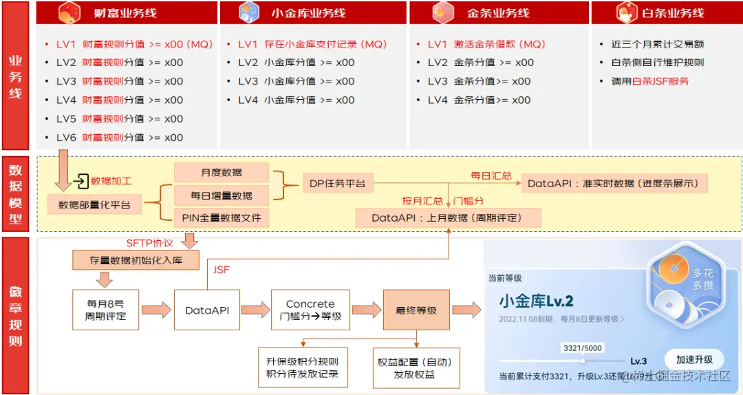 徽章体系依托于业务线的用户行为数据,经过量化平台加工之后的最终数据,作为等级评定依据,关键点如下: