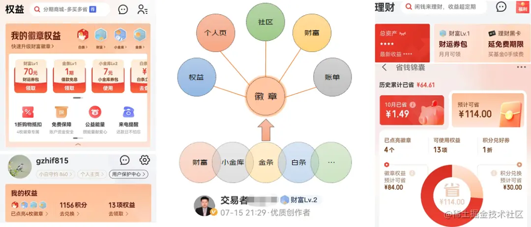 徽章属于业务线的徽章,徽章系统为各业务线提供了标准的接口服务,目前已渗透到权益场、支付页、个人页、财富页、社区、省钱锦囊、18权益日等场景。