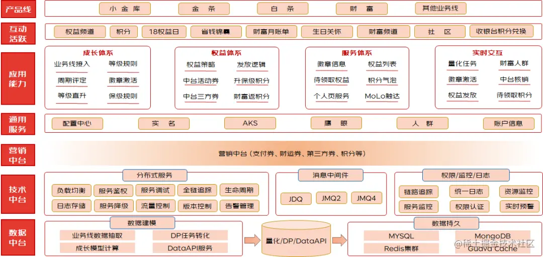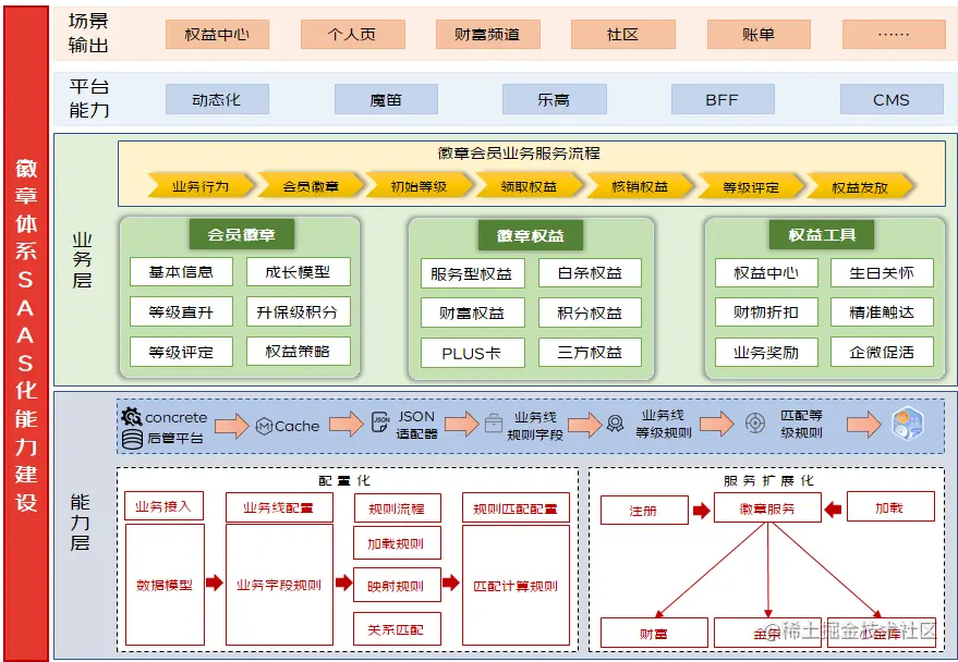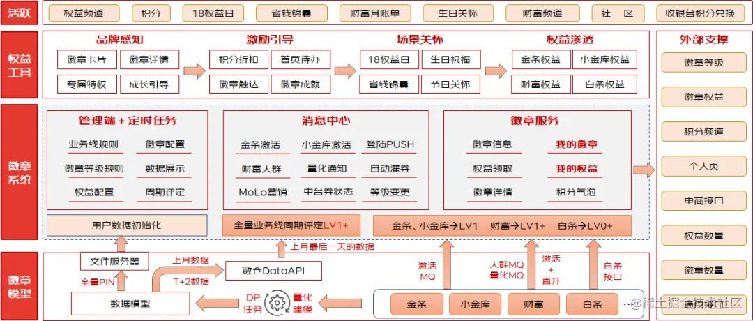 底层依赖于量化系统进行等级分值的计算评定,依赖于中台系统进行相关权益的发放,通过下图,可以对徽章体系有整体的认识。