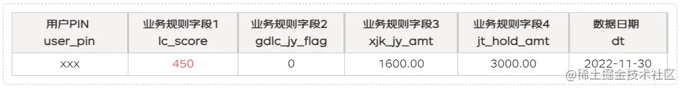 {"user_pin":"xxx","lc_score":"450","gdlc_jy_flag":"0","xjk_jy_amt":"1600.00","jt_hold_amt":"3000.00","dt":"2022-11-30}