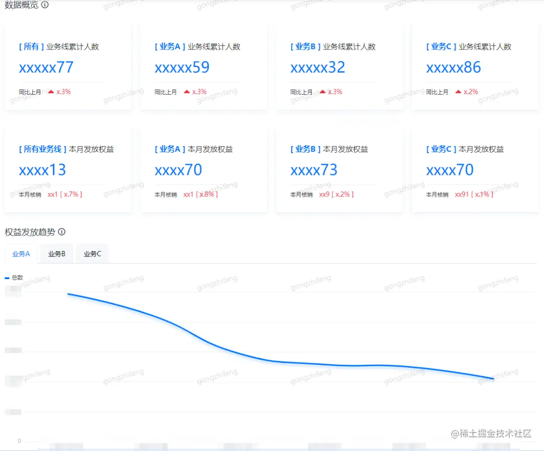 目前针对运营可能的数据诉求,打造了一版简易的数据看板,包括业务线的人数概览、本月发放权益数量、权益每日变化趋势。