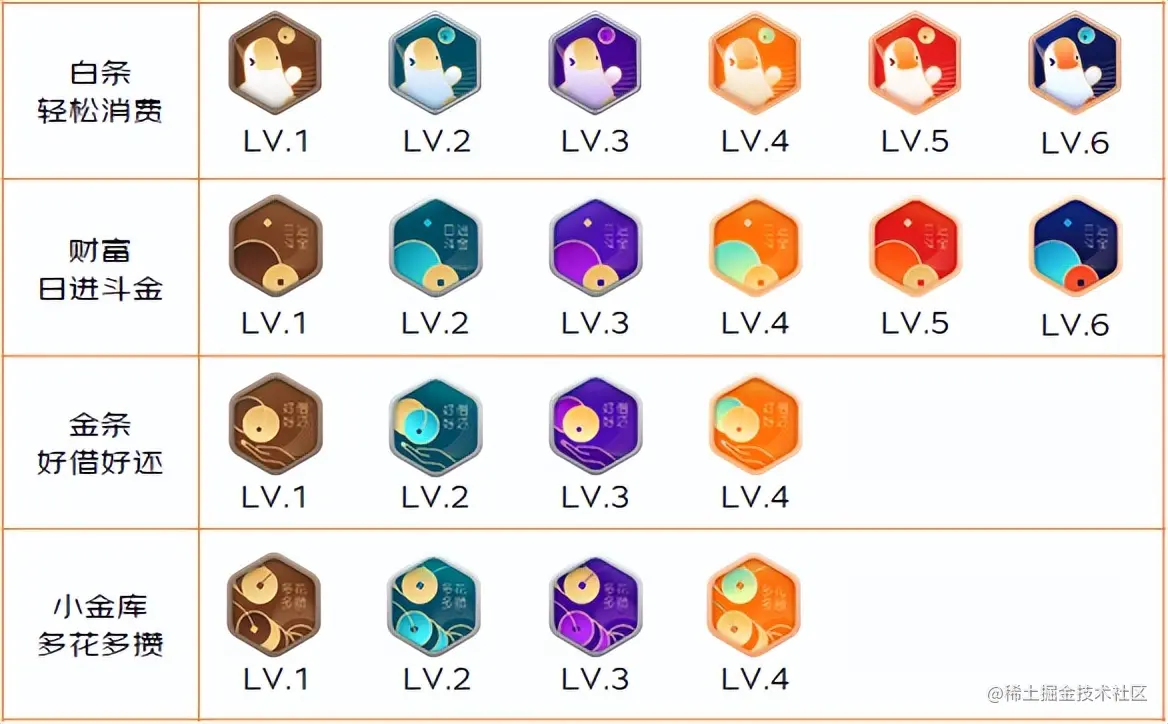 新版徽章系统,从业务视角进行等级划分,使会员等级拥有了业务属性,如下图所示,目前接入了四个业务线的徽章:白条、财富、金条和小金库。