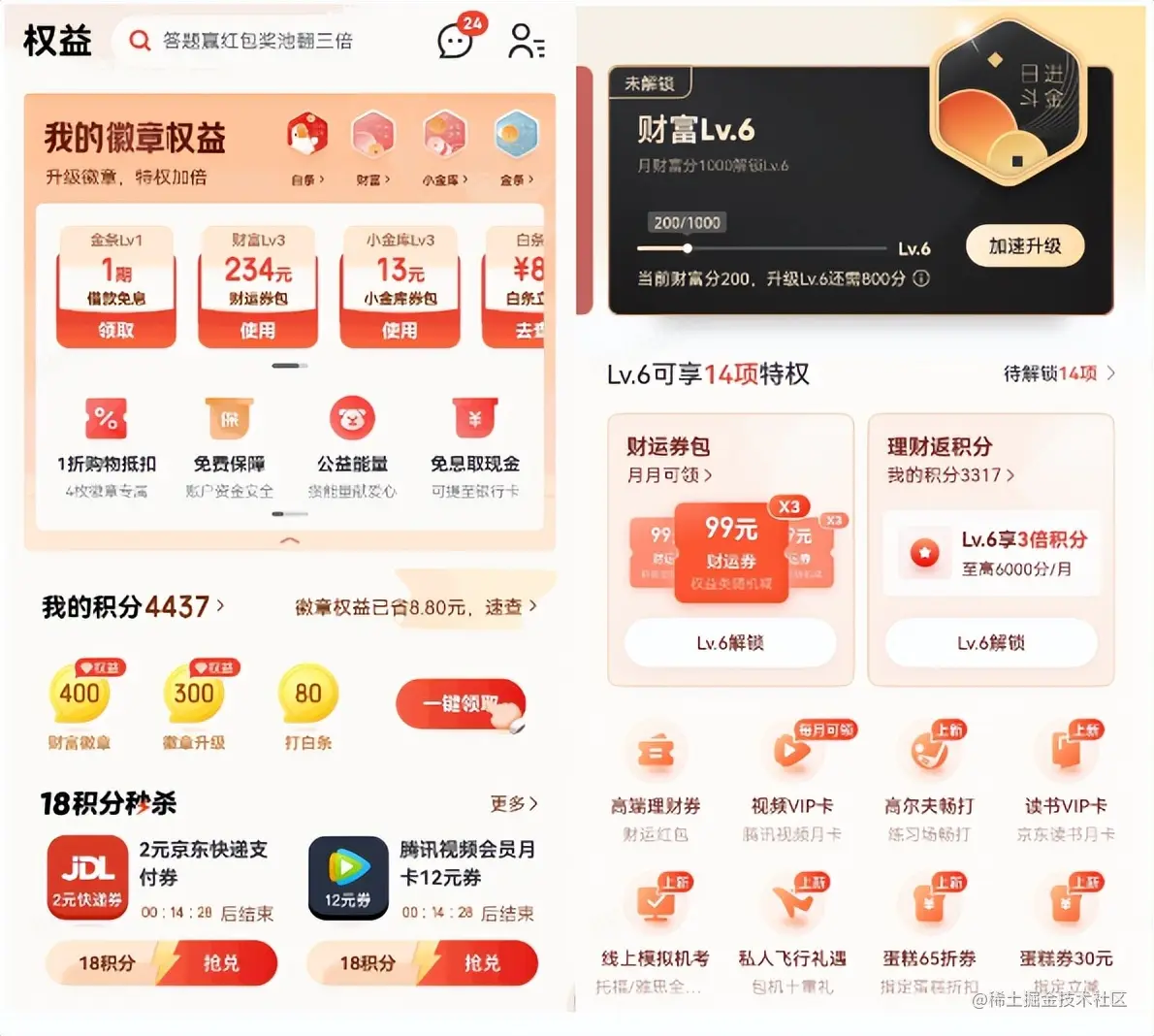 徽章的主页面入口位于金融APP下方的“权益”导航。