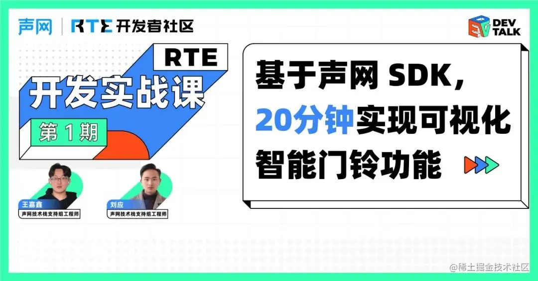 本次活动中,来自声网技术栈支持组的工程师 @刘应 和@王嘉鑫 将用 20 分钟的时间,基于声网 SDK 快速集成泛 IPC 类可视化智能门铃场景功能,实现在手机上查看门铃/门锁的视频画面,手机客户端和摄像机设备端语音双向对讲。