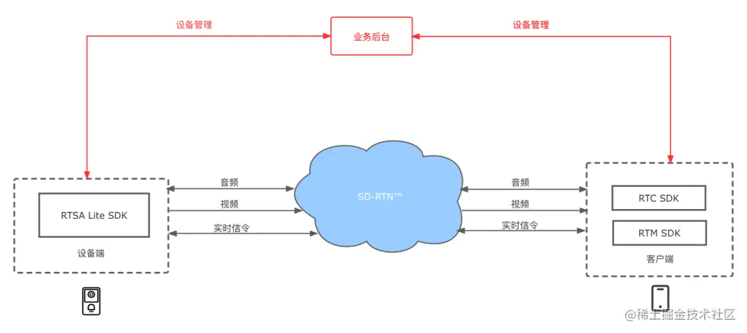 声网提供 RTSA Lite SDK 、 实时音视频(RTC)SDK 和 云信令(RTM)SDK 共同搭建智能门铃场景。(红色部分需开发者自行实现)