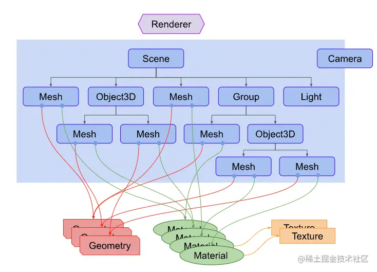 在开始之前,让我们尝试先来了解一下 three.js 应用程序的结构。Three.js 应用程序需要您创建一堆对象并将它们连接在一起。这是一个代表一个小的 three.js 应用程序的图表。