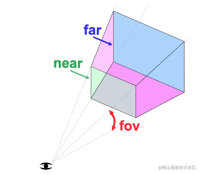 以下是透视相机的基本成像原理,其中位于近截面(near)和远截面(far)之间的物体才能被看到。近平面和远平面的高度由视野(fov)决定。两个平面的宽度由视野(fov)和纵横比(aspect)决定。
