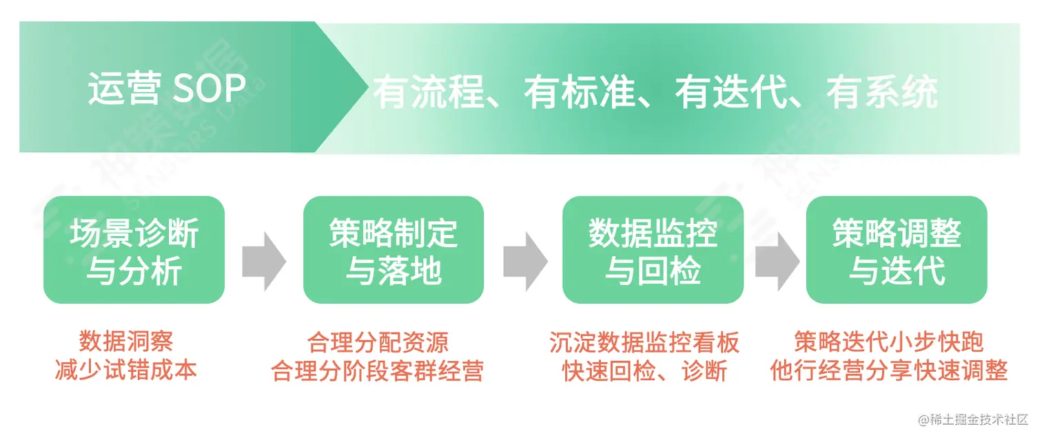 第二,闭环运营操作级 SOP。神策数据主打洞察-决策-行动-反馈的 SDAF 闭环运营,帮助行方明确每个环节的运营动作及执行人,培养人才的适配能力,解决组织层面的问题。