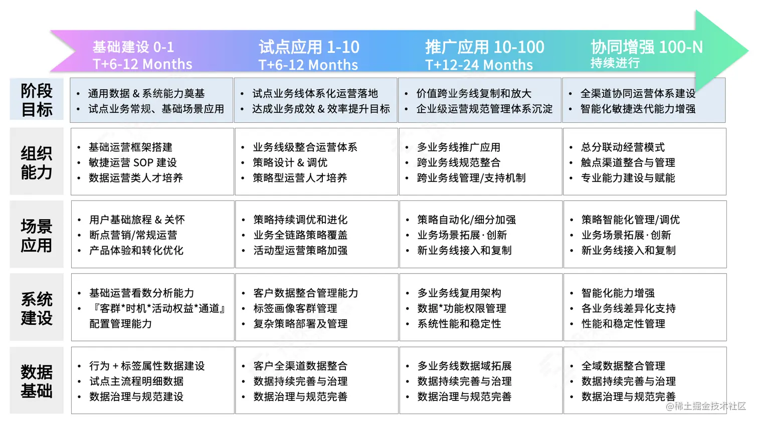 从关键能力的角度来看,银行数字化转型大体可分为以客户数据为中心的基础建设、分析洞察、数据运营;而从建设趋势来看,银行数字化转型可分为基础功能级运营阶段、场景化差异化运营阶段、自动化平台化运营阶段、规模化策略及总分联动运营阶段。