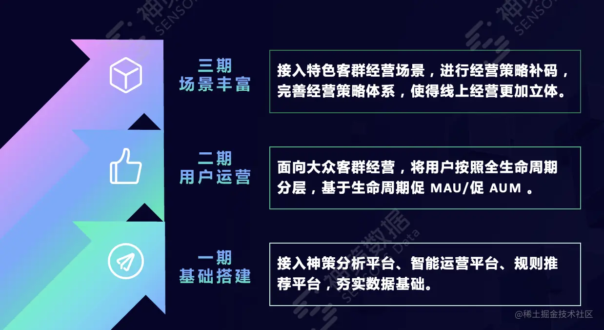 某农商行在与神策数据合作期间,将提升 MAU 和 AUM 作为重点经营方向,明确把大众客群经营作为一个体系单独来做。整个体系分三期来做:一期重点进行基础搭建,二期重点做用户运营,三期主要进行特色客群运营,重点关注农村贷款客群和村民客群。