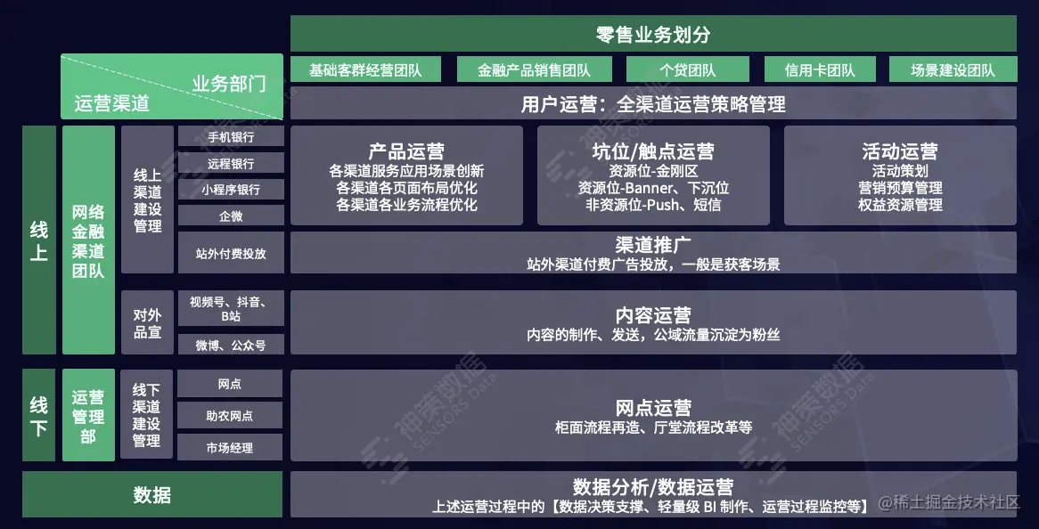从整个运营体系来看,以用户为中心的用户运营策略体系构建,是业务运作的统筹设计层,组织基于用户运营进一步规划基于渠道的产品运营、坑位/触点运营、活动运营,这些都是支撑整个数字化运营落地非常重要的能力体系。当然,从获客拓客角度上来讲,渠道推广、对外品宣的内容运营和网点运营也很重要。相对传统的运营体系,数字化运营要由数据基础板块来支撑上面所有的运营动作的整合、监控和优化。