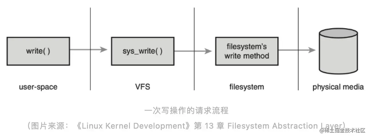 上图是一次写操作的请求流程,在 Linux 里写文件,其实就是一次 write() 系统调用。当你调用 write() 操作请求的时候,它会先到达 VFS,再由 VFS 去调用文件系统,最后再由文件系统去把实际的数据写到本地的存储介质。