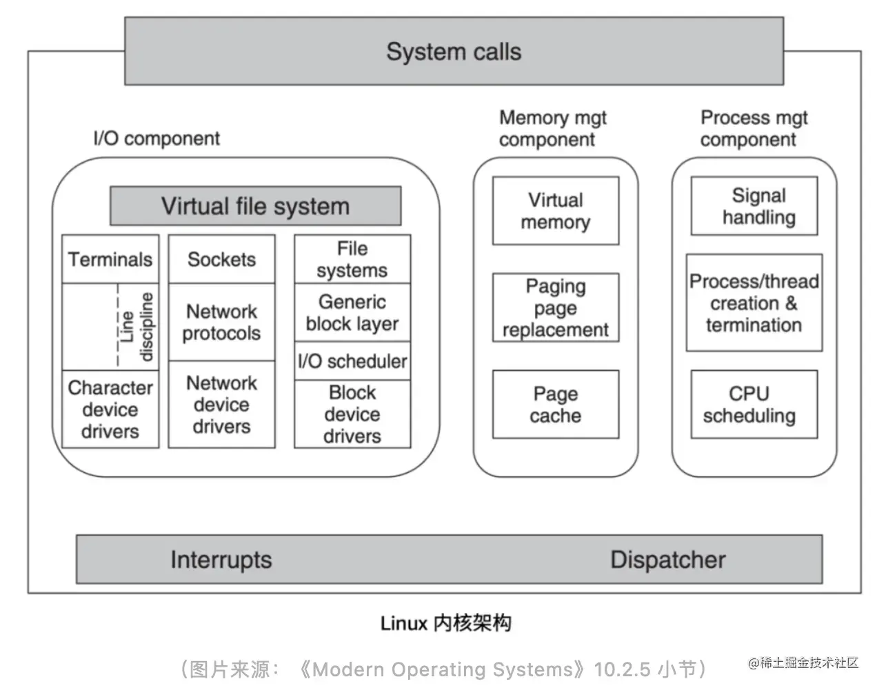 上图是 Linux 内核的架构,左边 Virtual file system 区域,也就是虚拟文件系统简称 VFS。它的作用是为了帮助 Linux 去适配不同的文件系统而设计的,VFS 提供了通用的文件系统接口,不同的文件系统实现需要去适配这些接口。