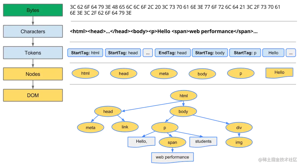 HTML文件之后,他收到的不是里面的内容,而是文件的字节数据 - 而接收到这些数据字节之后,根据文件的指定编码(例如 UTF-8 ) 以及一些转化让他们最终形成一系列标记(