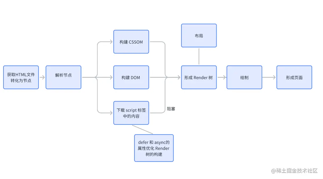 scrpt标签则会停止HTML解析流程,转而进行下载和加载解析javaScript代码,所以他会阻塞DOM树的生成。(详情可以见下文script标签)