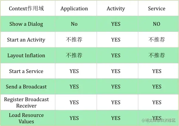 从上图我们可以发现Activity所持有的Context的作用域最广,无所不能。因为Activity继承自ContextThemeWrapper,而Application和Service继承自ContextWrapper,很显然ContextThemeWrapper在ContextWrapper的基础上又做了一些操作使得Activity变得更强大,这里我就不再贴源码给大家分析了,有兴趣的童鞋可以自己查查源码。上图中的YES和NO我也不再做过多的解释了,这里我说一下上图中Application和Service所不推荐的两种使用情况。 1:如果我们用ApplicationContext去启动一个LaunchMode为standard的Activity的时候会报错android.util.AndroidRuntimeException: Calling startActivity from outside of an Activity context requires the FLAG_ACTIVITY_NEW_TASK flag. Is this really what you want?这是因为非Activity类型的Context并没有所谓的任务栈,所以待启动的Activity就找不到栈了。解决这个问题的方法就是为待启动的Activity指定FLAG_ACTIVITY_NEW_TASK标记位,这样启动的时候就为它创建一个新的任务栈,而此时Activity是以singleTask模式启动的。所有这种用Application启动Activity的方式不推荐使用,Service同Application。 2:在Application和Service中去layout inflate也是合法的,但是会使用系统默认的主题样式,如果你自定义了某些样式可能不会被使用。所以这种方式也不推荐使用。 一句话总结:凡是跟UI相关的,都应该使用Activity做为Context来处理;其他的一些操作,Service,Activity,Application等实例都可以,当然了,注意Context引用的持有,防止内存泄漏。