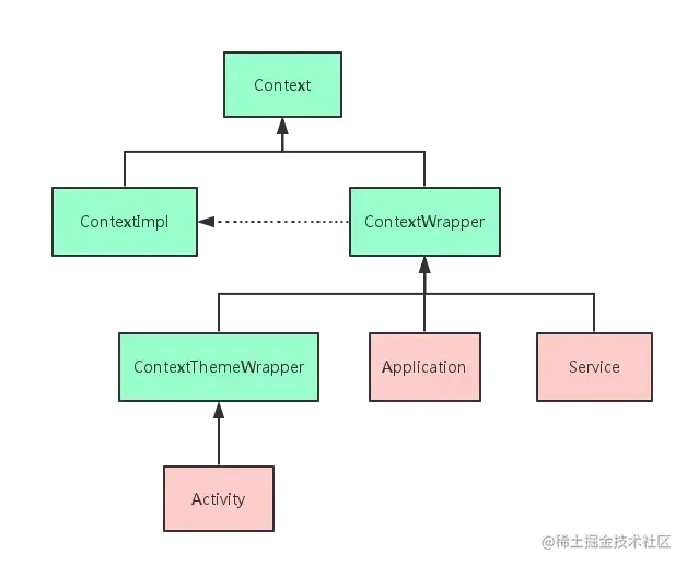 Context类本身是一个纯abstract类,它有两个具体的实现子类:ContextImpl和ContextWrapper。其中ContextWrapper类,如其名所言,这只是一个包装而已,ContextWrapper构造函数中必须包含一个真正的Context引用,同时ContextWrapper中提供了attachBaseContext()用于给ContextWrapper对象中指定真正的Context对象,调用ContextWrapper的方法都会被转向其所包含的真正的Context对象。ContextThemeWrapper类,如其名所言,其内部包含了与主题(Theme)相关的接口,这里所说的主题就是指在AndroidManifest.xml中通过android:theme为Application元素或者Activity元素指定的主题。当然,只有Activity才需要主题,Service是不需要主题的,因为Service是没有界面的后台场景,所以Service直接继承于ContextWrapper,Application同理。而ContextImpl类则真正实现了Context中的所以函数,应用程序中所调用的各种Context类的方法,其实现均来自于该类。一句话总结:Context的两个子类分工明确,其中ContextImpl是Context的具体实现类,ContextWrapper是Context的包装类。Activity,Application,Service虽都继承自ContextWrapper(Activity继承自ContextWrapper的子类ContextThemeWrapper),但它们初始化的过程中都会创建ContextImpl对象,由ContextImpl实现Context中的方法。