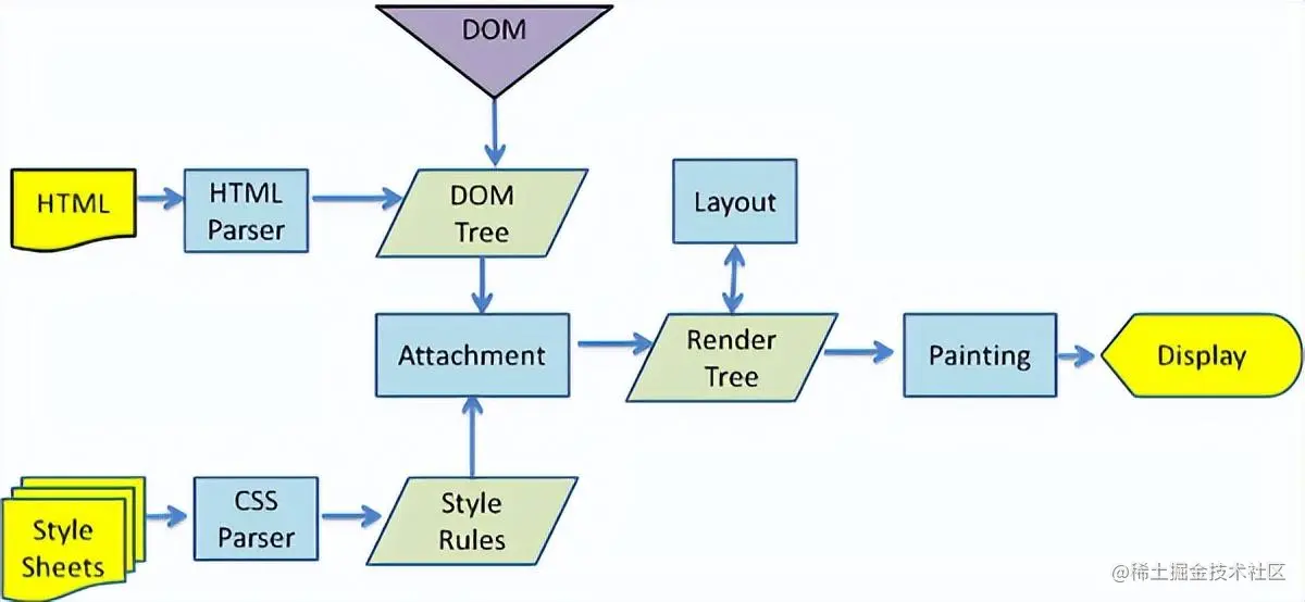在图中我们可以看到HTML解析出了一颗DOM tree,与此同时样式脚本则解析生成了一个style rules,也可以说是一个CSS tree。 最后,DOM tree同style rules一同结合解析出一颗Render Tree, 而Render Tree就是包含了一个dom对象以及为其计算好的样式规则,提供了布局以及显示方法。