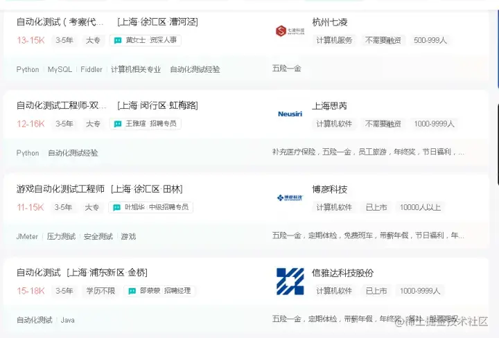 对于还没有入行的小伙伴或者刚毕业的同学,更多的是关注测试基础技能的掌握,即使不会自动化也是可以找到一份初级测试岗位的工作,会编程和自动化更多的是作为加分项,特别是今年找工作比往年来说更难了,行业越来越卷,测试的招聘要求中几乎都会出现自动化测试的字眼,因此会自动化测试也是自身的核心竞争力。基本上10k的工作都需要自动化测试这一项技能...自动化测试对大专学历真的很友好