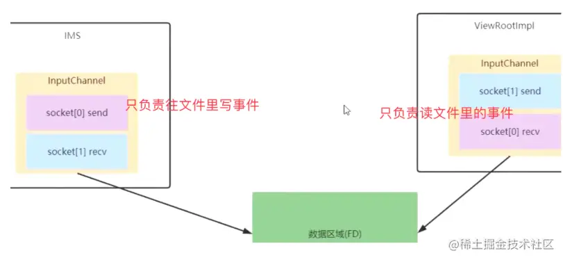 App进程中的ViewRootImpl和SystemServer中的IMS通过socketpair通信,因为事件产生的非常快且非常多使用binder通信不适合