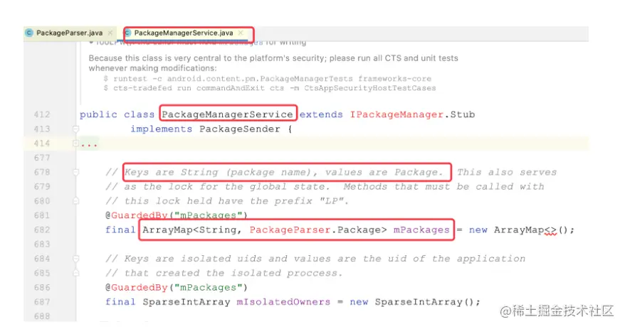 AndroidMnifest.xml,xml解析完会返回Package对象,每个APK对应一个Package对象,得到这个Package对象后,缓存到PackageManagerService的mPackages这个ArrayMap里;key为应用的包名,value为应用的Package; - Package对象中有解析出的对应App中的四大组件标签、权限标签等等,放入各自的List中,如:activites、services、revicers、providers、权限list等等;activites这些list存的只是一个javabean,而不是存的具体的应用层的Activity;