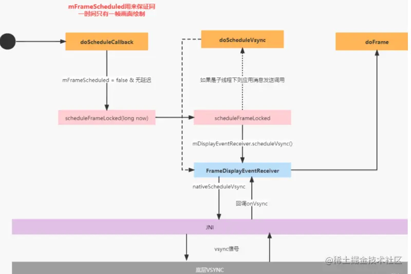 - 走doFrame去逻辑管控, 判断当前时间离上次绘制的时间大于了1帧的时间(16.66毫秒) 就跳帧(卡顿优化有用到),若小于16.66毫秒就再次请求垂直同步信号,防止重叠