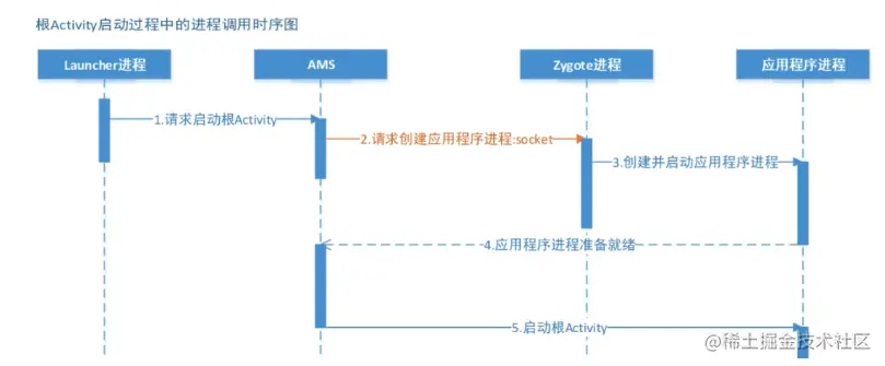 - AMS请求zygote进程创建App进程;zygote进程比较特殊, 使用Socket通信,而不是binder;zygote是所有应用的孵化器,zygote进程挂掉时,手机会自动重启;