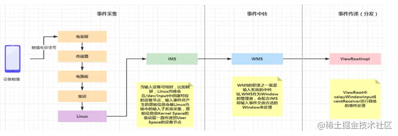 InputReaderThread中开启循环,对EventHub对象进行getEvent(); getEvent()中有epoll_wait;相当于wait-notif机制;唤醒的触发点时dev/input下的文件被改变;InputReaderThread将dev/input文件夹下面的事件信号文件数据进行 提取、封装,然后交给InputDispatherThread;InputDispatherThread最终选择到对应的ViewRootImpl(window)进行分发数据;- 这里App进程和SystemServer两个进程通过Socketpair进行通信;两个进程一边一组socketpair;