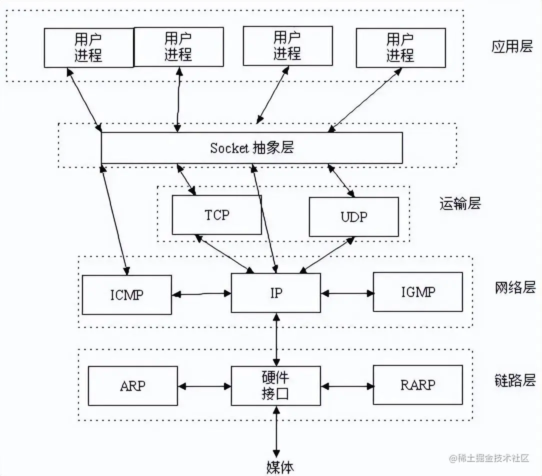 Socket是应用层与TCP/IP协议族通信的中间软件抽象层,它是一组接口。在设计模式中,Socket其实就是一个门面模式,它把复杂的TCP/IP协议族隐藏在Socket接口后面,对用户来说,一组简单的接口就是全部,让Socket去组织数据,以符合指定的协议。