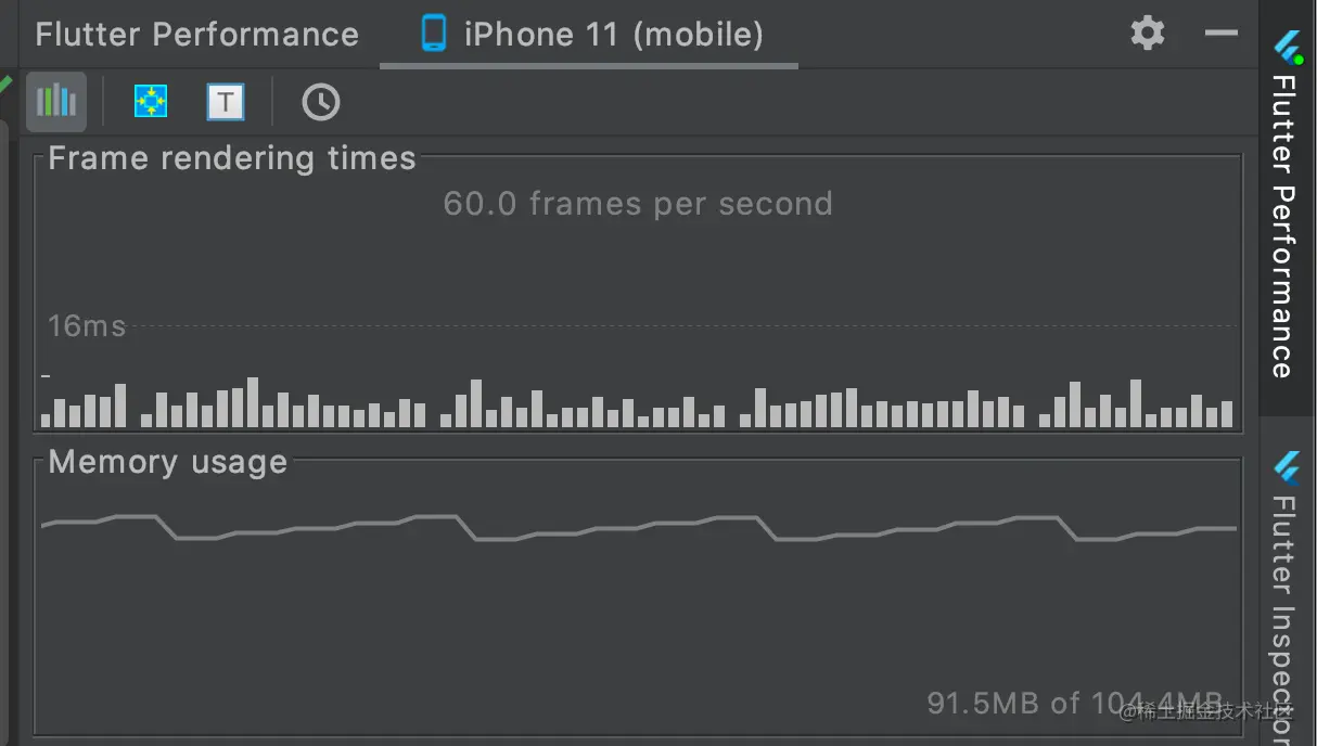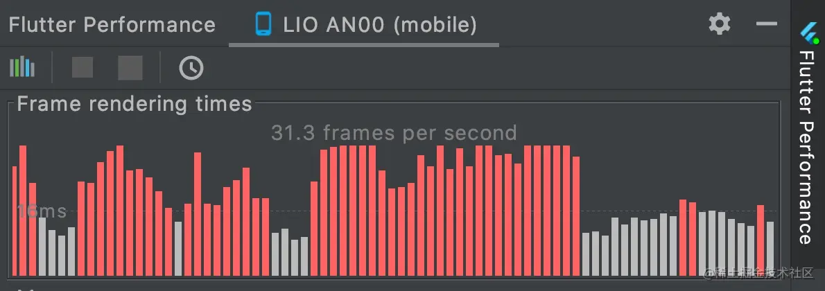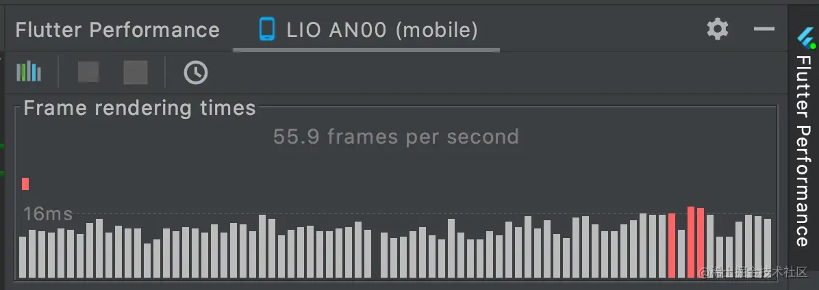 决定列表性能的好坏一个很关键的因素就是帧率,通常情况下手机的刷新频率为60fps,当然目前陆续出现一些高刷屏的手机能够达到90甚至120的fps。在Flutter中获取应用的帧率我们可以通过Flutter Performance选项卡来查看页面帧率: