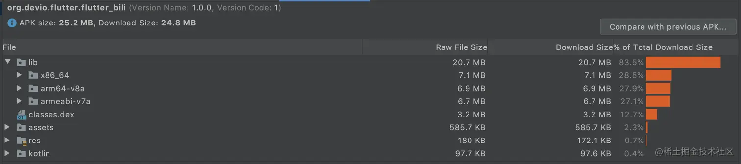 默认情况下通过AS或者./gradlew assembleRelease 构建出来的Release包是包含所有ABI架构的,通过分析一个为优化的Flutter应用包你会发现so是包体积是最大的一项: