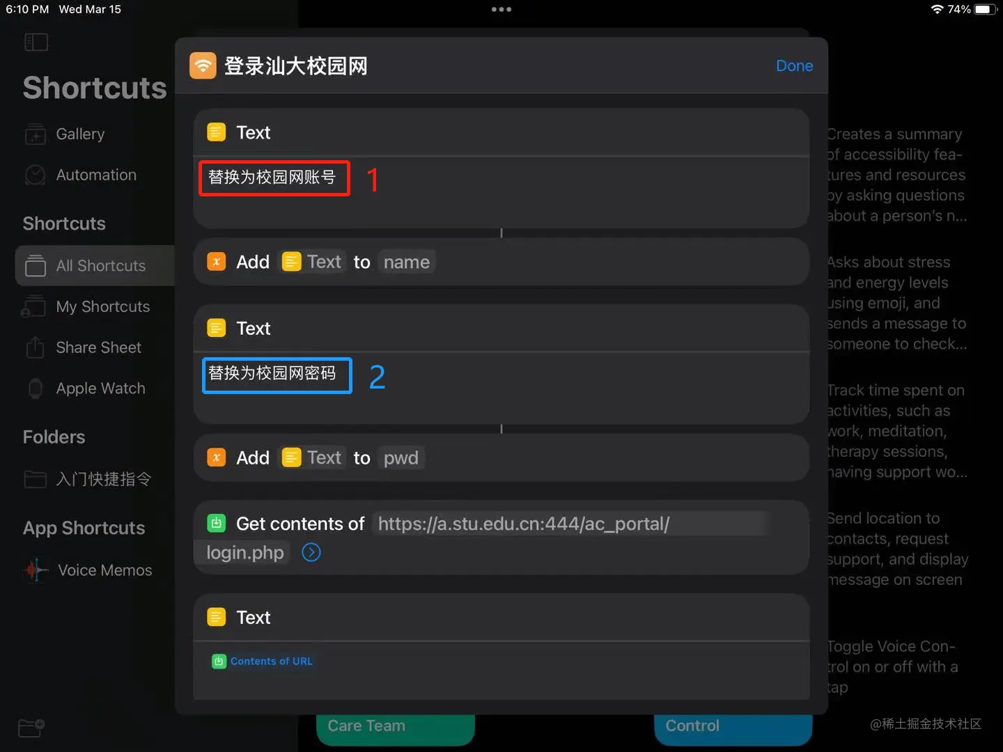 接着这个制作好的快捷指令会出现在你的指令列表里,点击它卡片右上角的三个小点进行编辑以配置账号密码。