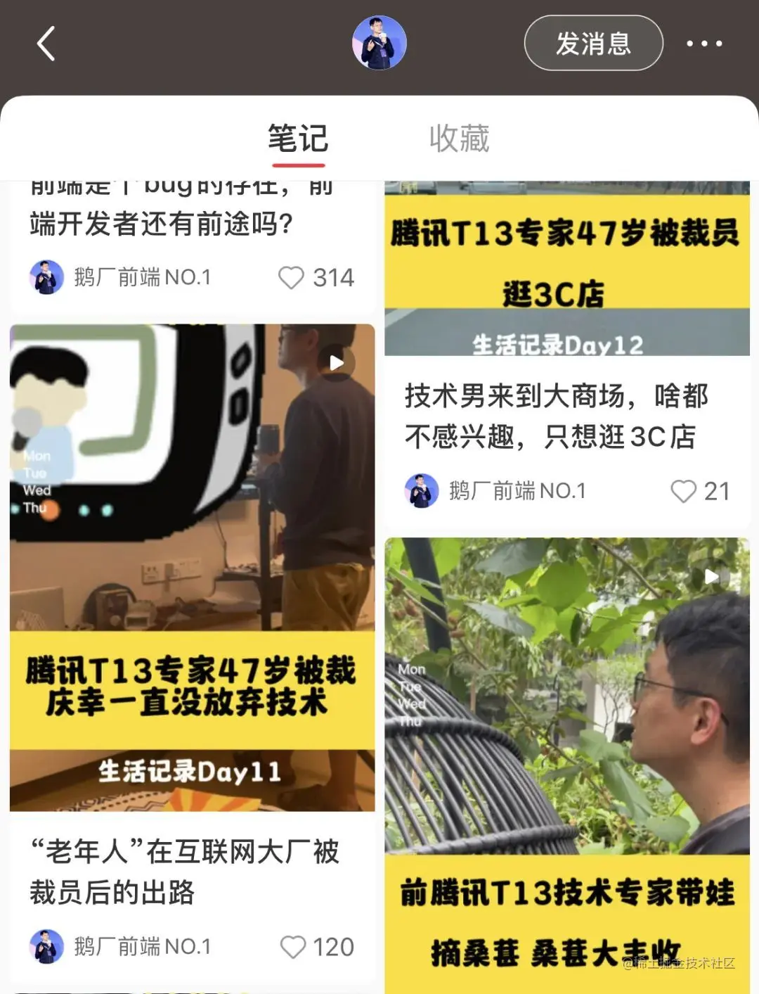 最近被媒体炒起来,是因为他老婆在小红书上以他的名义注册了一个号:“鹅厂前端NO.1”(你瞅这流量满满的昵称),从3月份开始持续发布一些她的感受和表达。