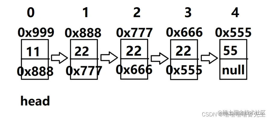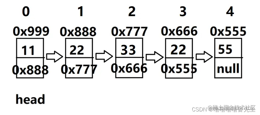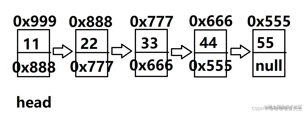 定义一个head,存储头节点(第一个节点)的地址(假设为0x999)。