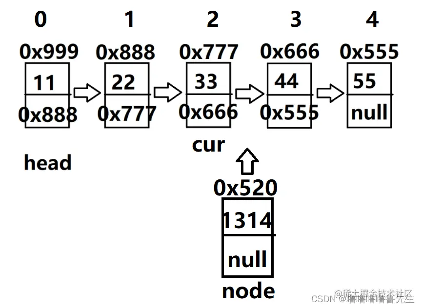 比如,我们把一个值为1314,地址是0x520(设为node引用)的节点,即val域值为1314,next域为null,地址是520,将该节点插入至3号位置,