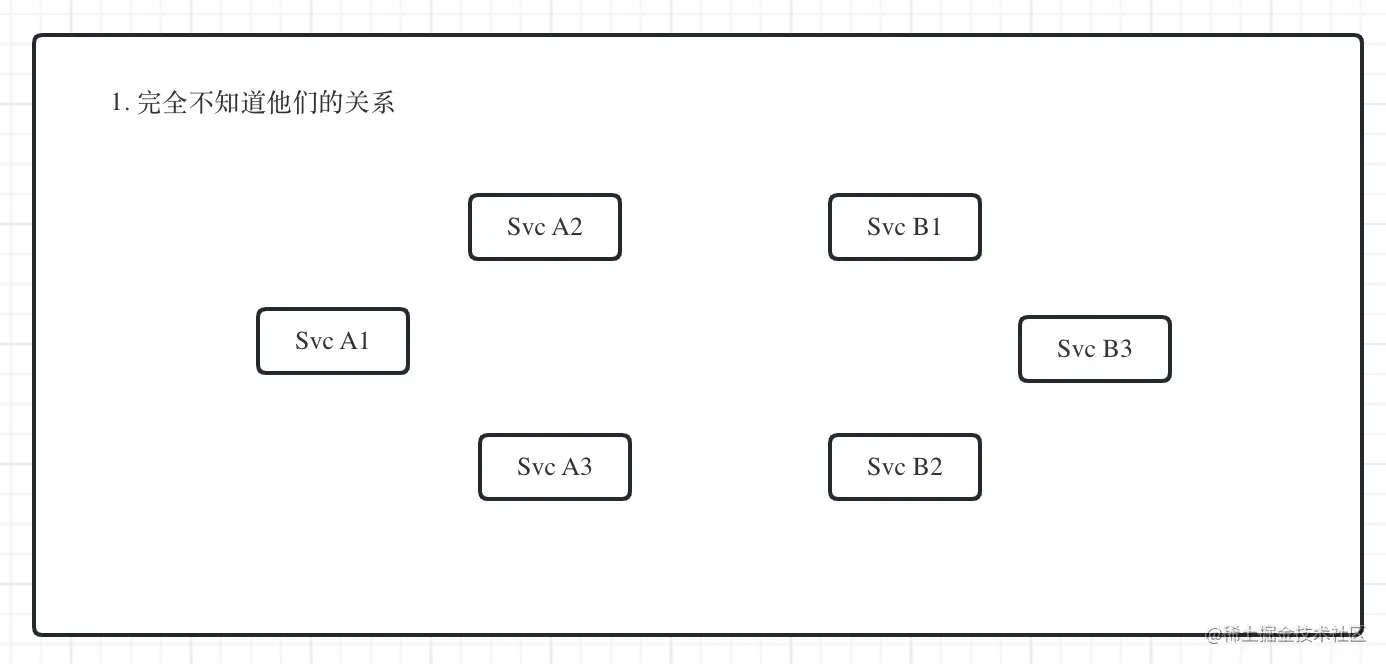 现在假设有 6 个服务, SvcA 1-3 , SvcB 1-3, 这 6 个服务可能分布在不同机器上面。