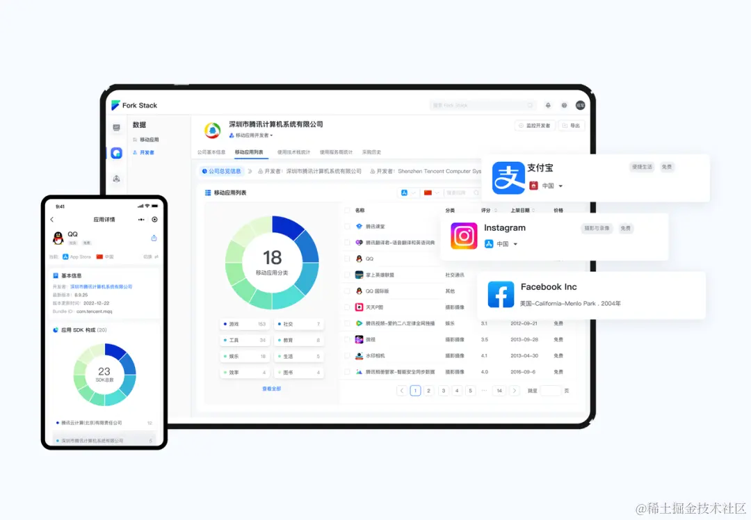 **Fork Stack 基于 SDK、CDN/云主机数据洞察,对全网超过 1,000 万的 APP 和 Web 网站进行实时扫描和技术栈分析,**深度洞察云服务及其目标客户(产品)之间的上下游供应链关系,构建云服务产品和目标客户的「供应链信息中台」,帮助云服务销售简单、高效地过滤出高价值客户线索。