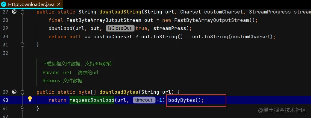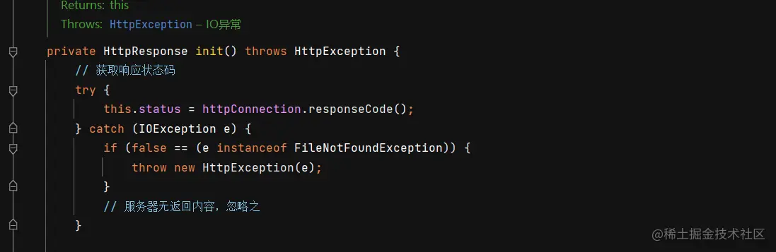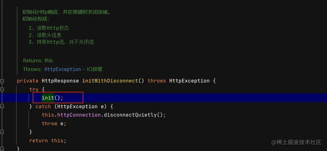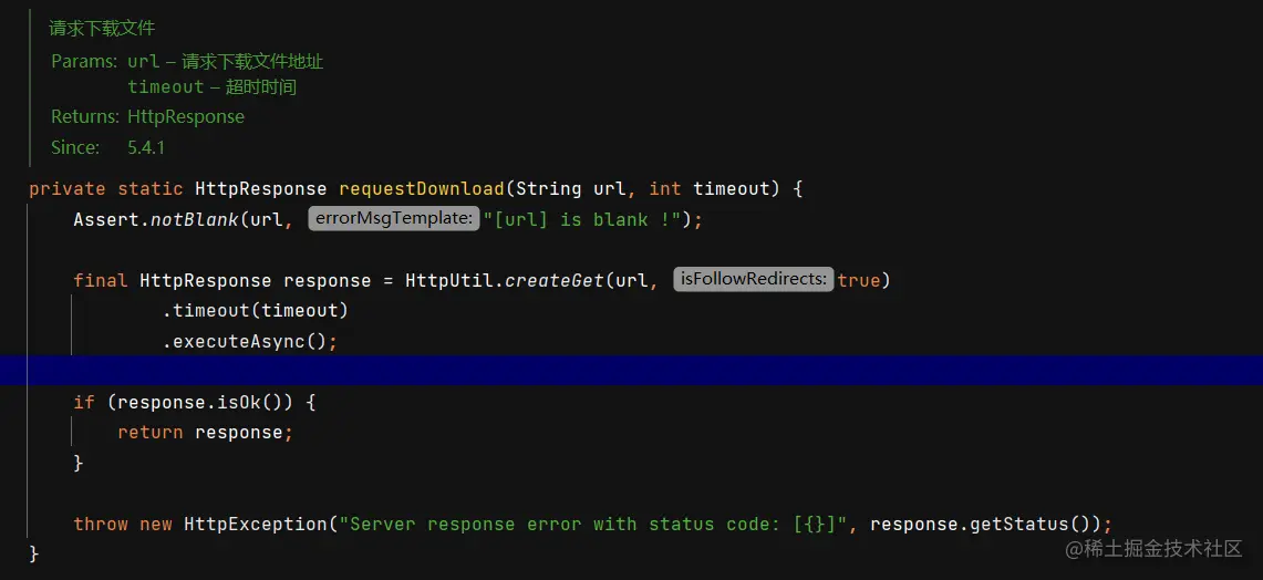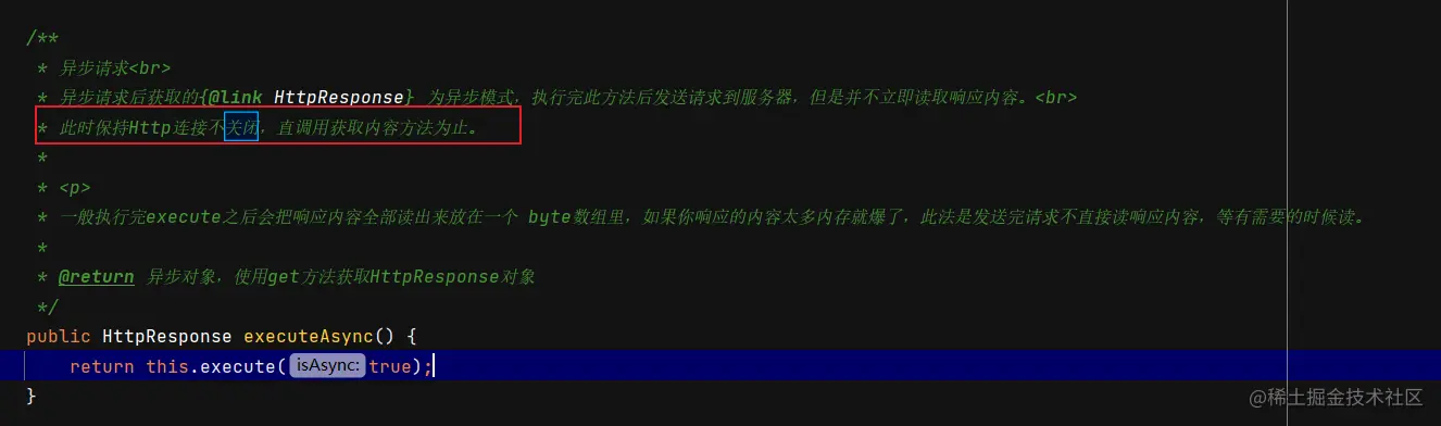 hutool为什么不需要关闭http请求 user_sw 2023-03-16 1,539 阅读1分钟 在网上搜索hutool的http请求为什么不需要手动关闭时,百度给我推送一堆无用的回答,都是关于hutool的HttpGet,HttpPost的使用,想想还是自己去寻找答案,在此记录一下。 1. 同步请求的关闭 追踪execute方法可以发现答案,response时在finally中关闭了: 2. 异步请求的关闭 在获取请求体时关闭方法也是forceSync方法进行关闭: 可以查找到获取请求体的方法,这里有执行下载方法的一个引用: 追踪下去就能追踪到异步变为同步关闭的方式: 至此,收官!