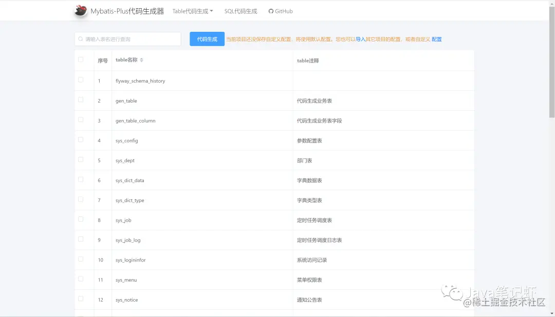 它是对mybatis-plus-generator进行封装,通过Web UI快速生成兼容Spring boot,mybatis-plus框架的各类业务代码。提供交互式的Web UI用于生成兼容mybatis-plus框架的相关功能代码,包括Entity、Mapper、Mapper.xml、Service、Controller等,可以自定义模板以及各类输出参数,也可通过SQL查询语句直接生成代码。
