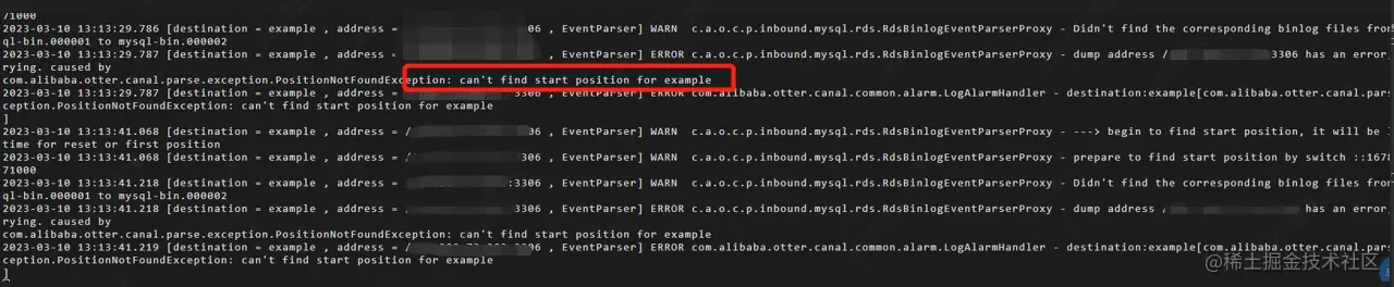通过排查之后我在服务器中 canal 下的 /usr/local/logs/example/example.log 文件里发现了问题所在。