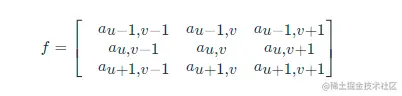 展开来分析二维卷积计算过程就是,首先得到原始图像矩阵中(u,v) 处的矩阵: