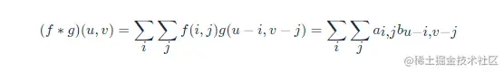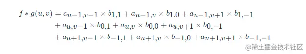 按照卷积公式的定义,则目标图片的第(u,v) 个像素的二维卷积值为: