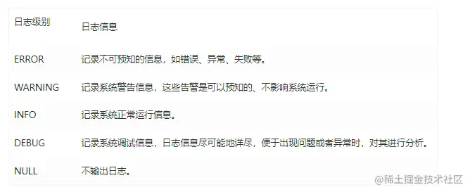 不同日志级别打印的日志内容详细程度不同,因此,问题定位时可以使用最详细日志(DEBUG)打印,而验证性能时使用最简日志(ERROR)打印即可。日志功能提供了5种级别供大家选择使用: