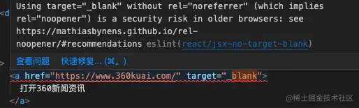相信大家对 eslint 一类的代码规范化工具肯定不会陌生了吧。现在的前端开发环境一般都是多人开发的模式,为了规范大家的编码规范,开发环境肯定会加入 eslint。我们开发时新建标签页打开一个链接,会用到 <a target="_blank"> 的语法,然而,使用 ESLint (react/jsx-no-target-blank ) rule时,会警告要加上 “rel="noreferrer noopener"”