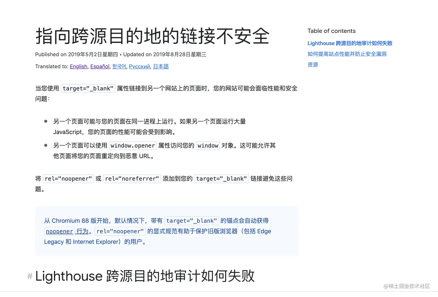 - 从 Chromium 88 版开始,默认情况下,带有 target="_blank" 的锚点会自动获得 noopener行为。rel="noopener" 的显式规范有助于保护旧版浏览器(包括 Edge Legacy 和 Internet Explorer)的用户。