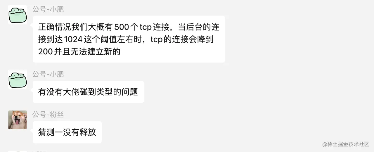 他们有很多的 IOT 设备与服务端建立连接,当增加设备并发请求变多,TCP连接数在接近1024个时,可用TCP连接数会降到200左右并且无法建立新连接,而且分析应用服务的GC和内存情况均未发现异常。